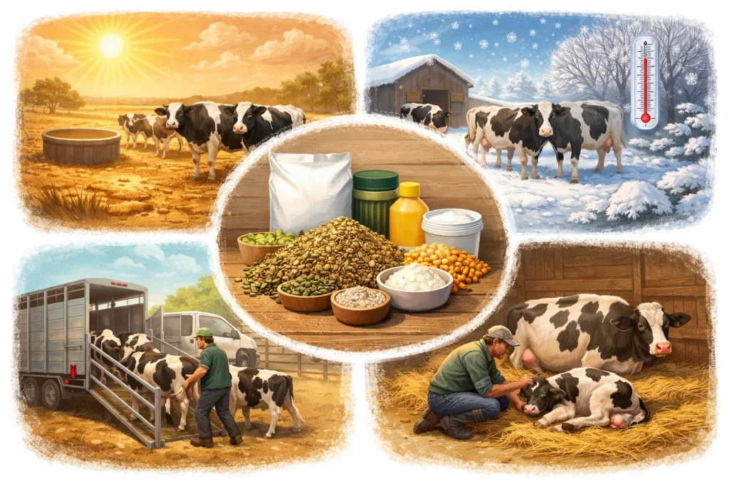 Стресс в животноводстве — не исключение, а рабочая реальность. Жара, холод, перегруппировка, отёл, транспортировка — всё это происходит регулярно, даже в хорошо организованном хозяйстве. Вопрос не в том, будет ли стресс, а в том, как организм животного его переживёт.